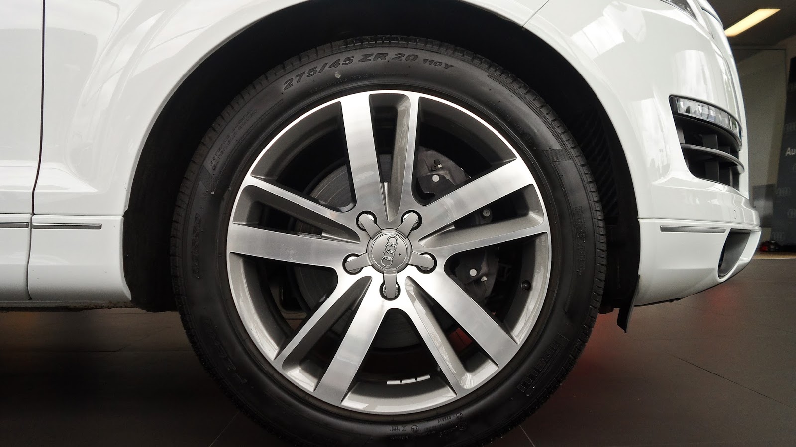 Externamente, o Q7 se impõe pela iluminação frontal e traseira em LEDs, elegantes faróis de xenônio nos fachos baixo e alto, retrovisores com rebatimento elétrico, com memória e aquecimento; rack de teto em tom alumínio, rodas de alumínio aro 20” (com pneus 275/45) e saída dupla de escape.