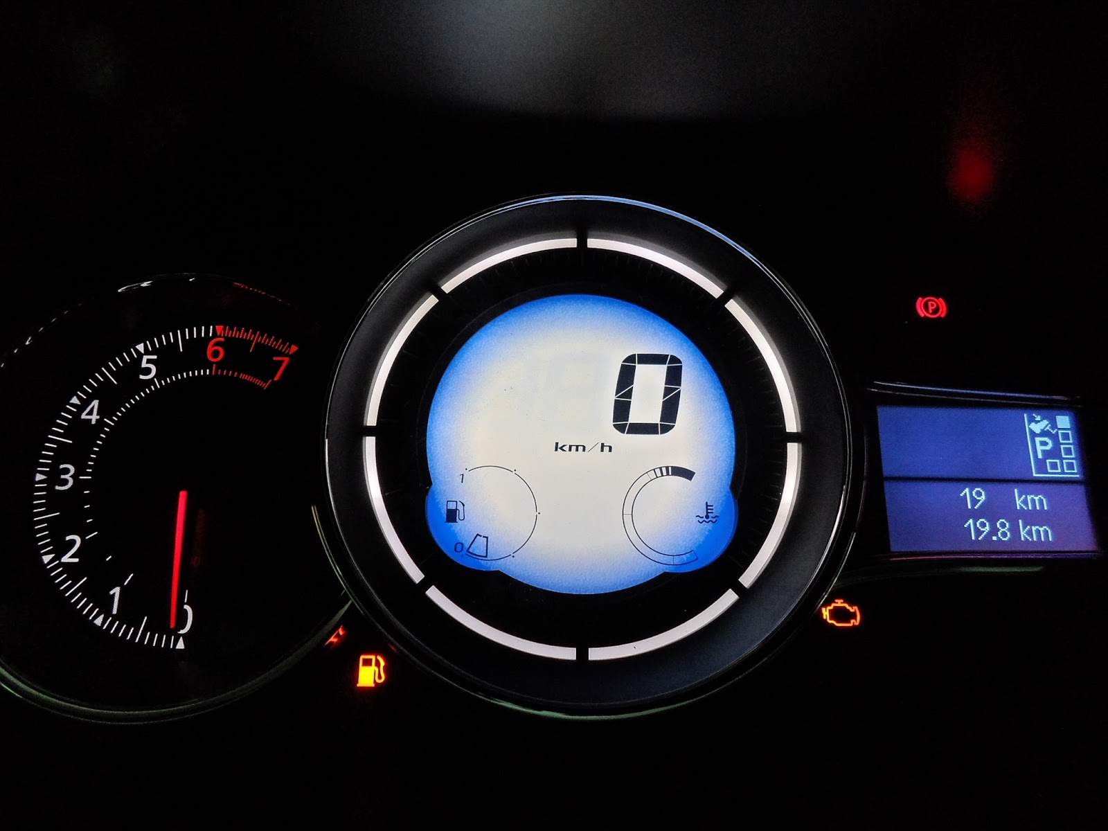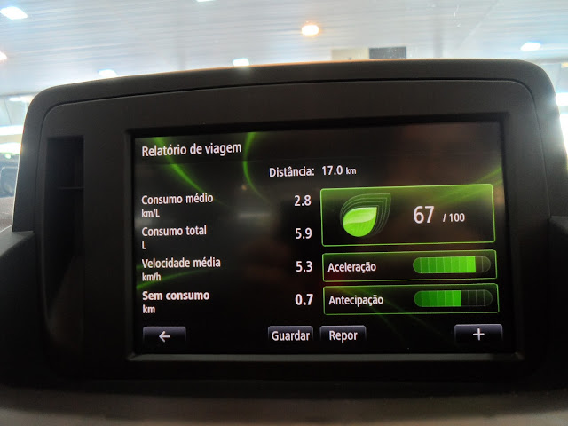 O quadro de instrumentos conta com velocímetro, nível de combustível, temperatura do motor e indicador de portas abertas no visor central, enquanto o mostrador à direita exibe a marcha engatada, distância percorrida, combustível gasto e consumo, entre outras informações.