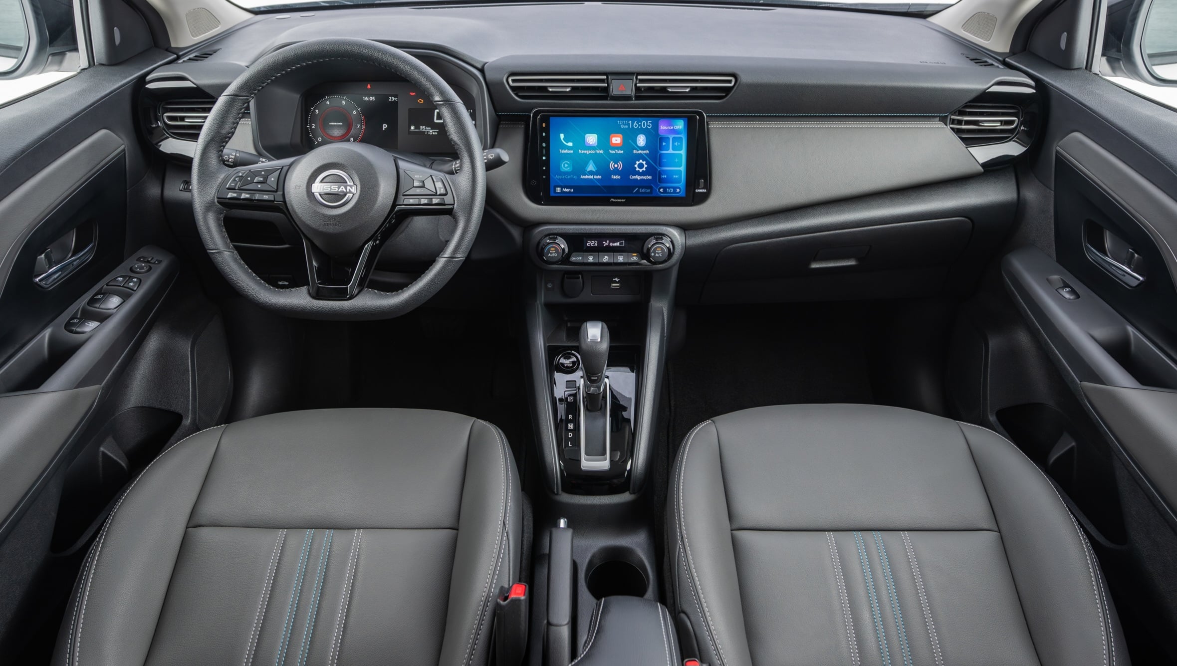 A ampla cabine do Kait exibe design moderno, reforçado pelo painel de instrumentos digital de 7 polegadas e 100% personalizável. De acordo com a versão, é adotado um tipo diferente de material de revestimento, sendo que, na topo de linha Exclusive, os bancos têm acabamento premium de dois tons e costuras com cor contrastante. A conectividade do Nissan Kait é destaque com a multimídia de 9 polegadas, disponível nas versões Advance Plus e Exclusive. O equipamento tem tela sensível ao toque com resolução de 1024 x 600 pixels, além de contar com processador de som AK7604, da AKM, para produzir um áudio de alta qualidade.