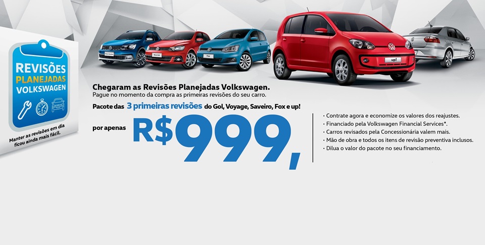 A Volkswagen do Brasil disponibiliza neste mês de janeiro aos proprietários dos modelos up!, Fox, Gol, Voyage e Saveiro o programa Revisões Planejadas Volkswagen. Oferecido em toda a rede de concessionárias da marca no território nacional, o pacote de três revisões – válido por três anos ou até 30.000 quilômetros rodados – custa R$ 999,00 e inclui todos os itens previstos no Manual do Veículo. A iniciativa faz parte de um conjunto de ações voltadas à fidelização dos clientes da marca, um dos pilares estratégicos da Volkswagen em 2017.